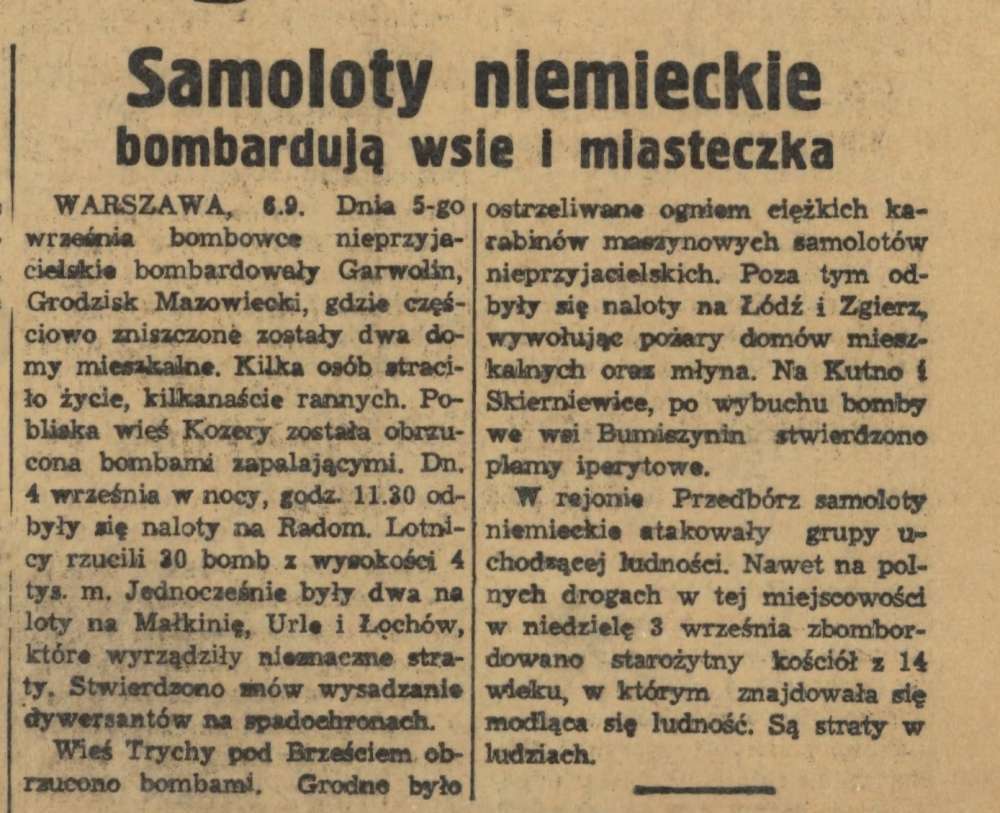 Niemieckie bomby „…padały też na stogi, bomby te przeważnie nie wybuchały. Również w wielu miejscowościach lotem nurkowym ostrzeliwali lotnicy z karabinów pasące się bydło. Zanotowano również wypadki, w których z aeroplanów ostrzeliwano rolników przy pracy w polu…" .