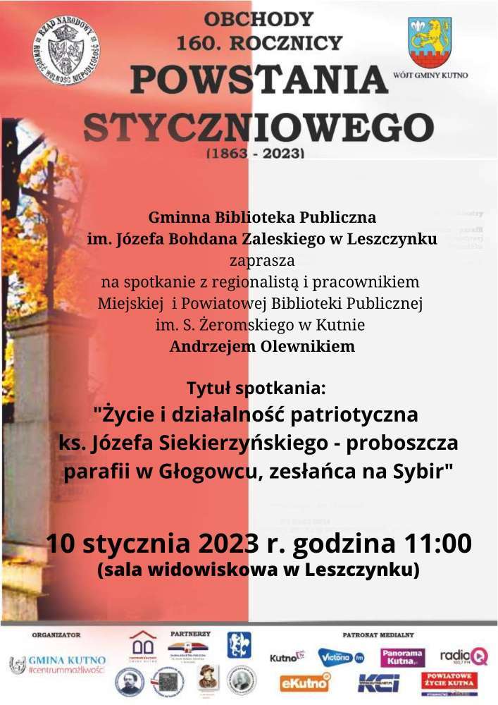 Już we wtorek 10 stycznia 2023 roku zapraszamy na spotkanie z regionalistą i pracownikiem Miejskiej i Powiatowej Biblioteki Publicznej im. S. Żeromskiego w Kutnie Andrzejem Olewnikiem pt. „Życie i działalność patriotyczna ks. Józefa Siekierzyńskiego - proboszcza parafii w Głogowcu, zesłańca na Sybir" organizowane w ramach Obchodów 160. rocznicy powstania styczniowego.