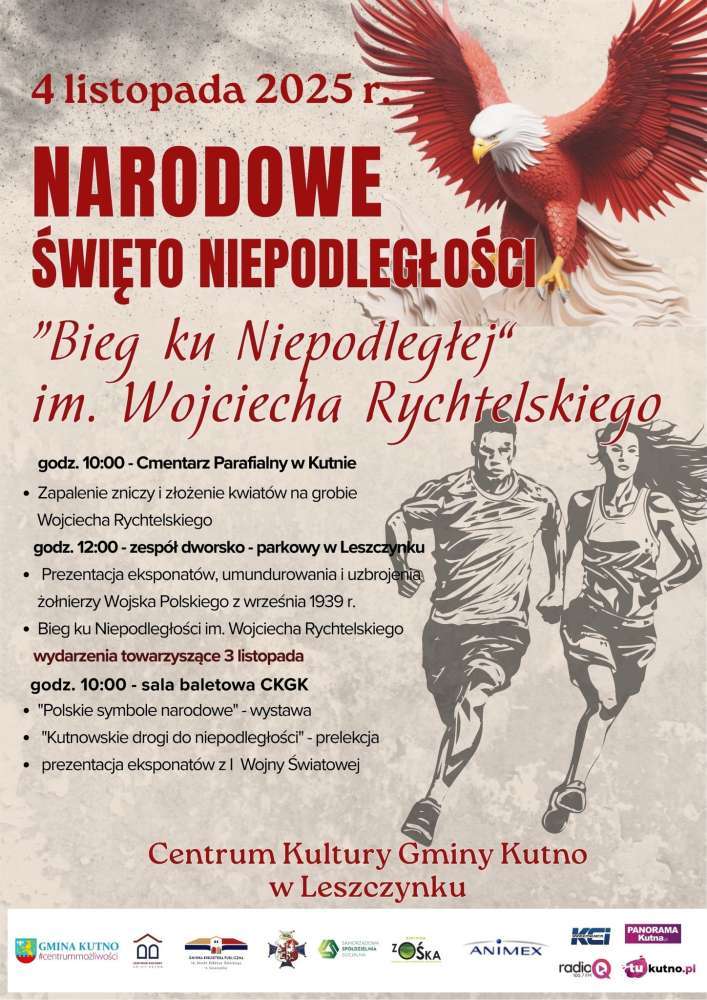 Serdecznie zapraszamy wszystkich mieszkańców oraz gości na uroczyste obchody Narodowego Święta Niepodległości, które odbędą się 4 listopada w Centrum Kultury Gminy Kutno w Leszczynku. W tym wyjątkowym dniu uczcimy 107. rocznicę odzyskania przez Polskę niepodległości — wspólnie oddając hołd tym, którzy walczyli o wolność naszej Ojczyzny. Obchody uświetni Bieg Niepodległościowy ku pamięci Wojciecha Rychtelskiego — żołnierza Legionów Polskich.