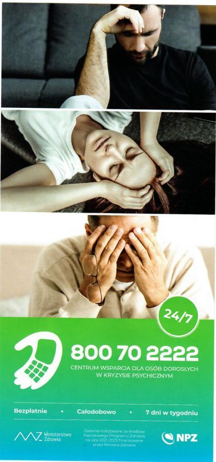 Informujemy, że od 1 grudnia 2021 roku działalność wznowiło Centrum Wsparcia dla Osób Dorosłych w Kryzysie Psychicznym. W ramach projektu oferowane jest całodobowe wsparcie psychologiczne oraz kontakt ze specjalistami.