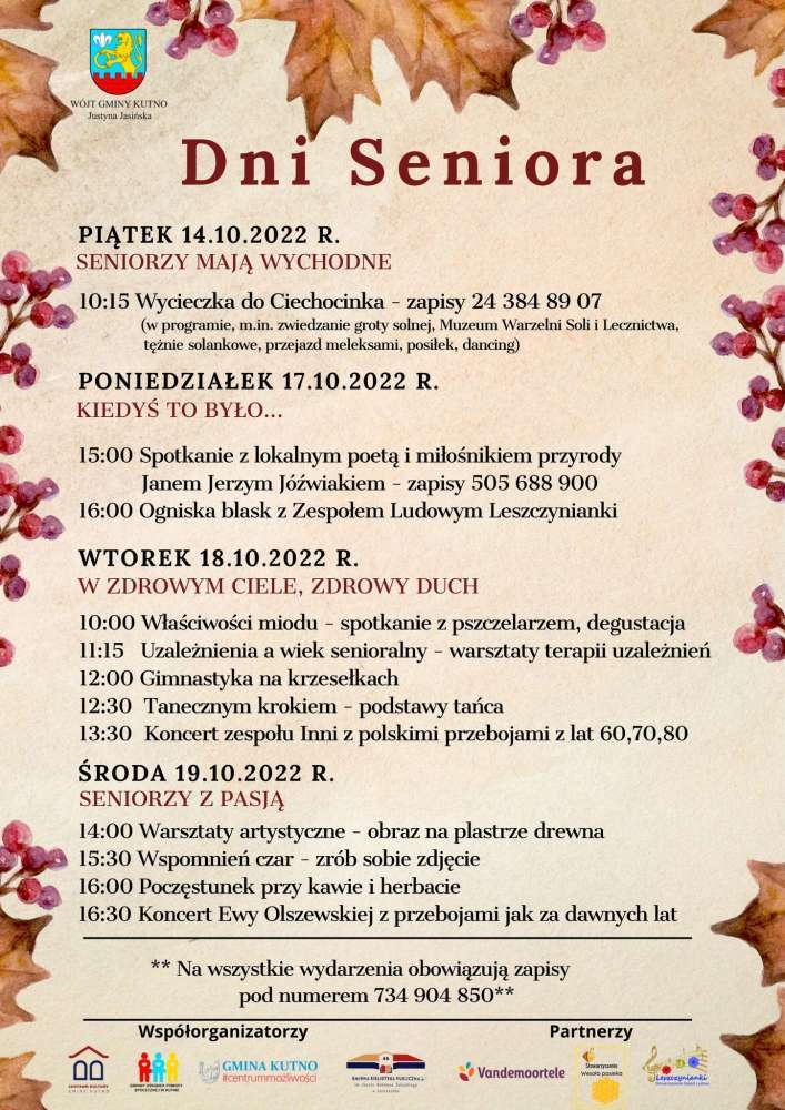 Już jutro rozpoczynają się Dni Seniora, organizowane przez Gmina Kutno, Centrum Kultury Gminy Kutno, Gminny Ośrodek Pomocy Społecznej oraz Gminna Biblioteka Publiczna im. Józefa Bohdana Zaleskiego w Leszczynku. W programie znalazły się m.in. wykłady, warsztaty, koncerty, nauka tańca, ognisko czy wycieczka. Jest to bardzo ważne wydarzenie integrujące Seniorów i dające im możliwość spędzenia czasu w ciekawy i kreatywny sposób. Serdecznie zapraszamy.