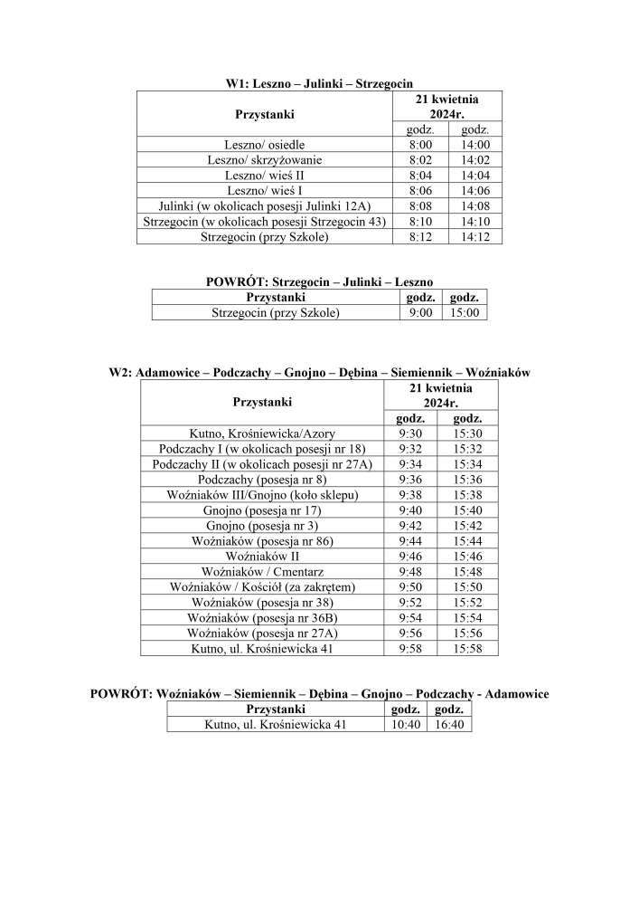 Poniżej udostępniamy przebieg dodatkowych tras linii obsługujących wybory 2024 oraz rozkład jazdy dla poszczególnych linii tj. W1, W2.