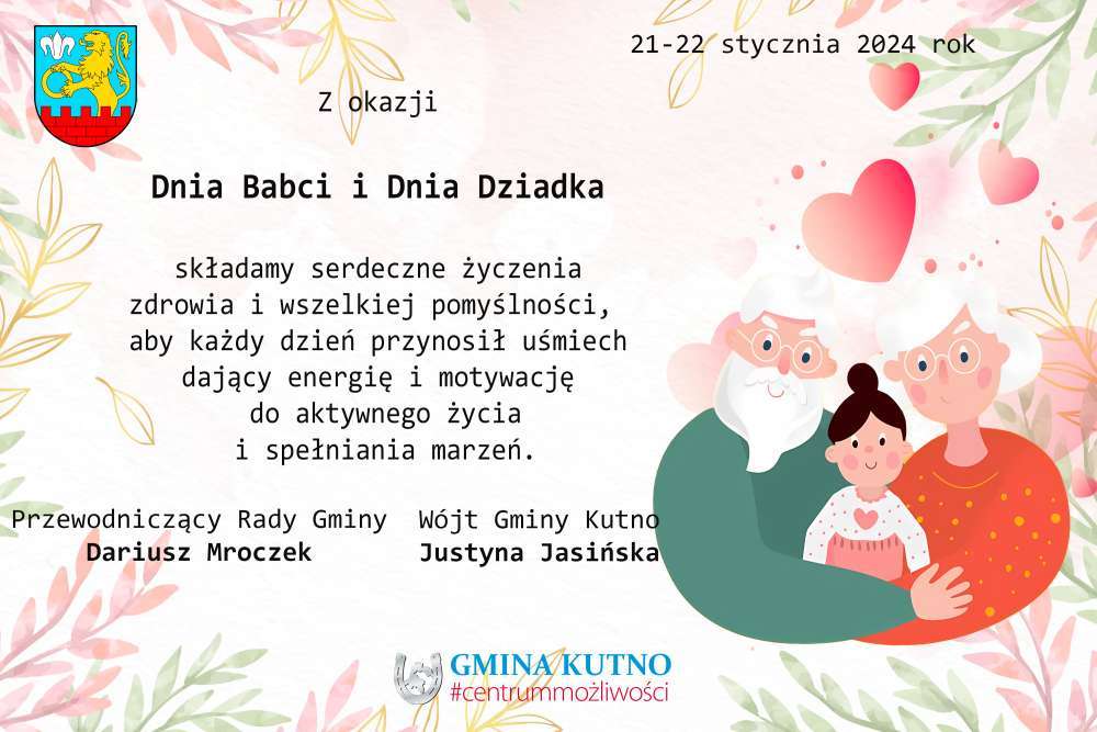 Z okazji zbliżających się Dnia Babci i Dnia Dziadka Wójt Gminy Kutno Justyna Jasińska i Przewodniczący Rady Gminy Dariusz Mroczek składają serdeczne życzenia.