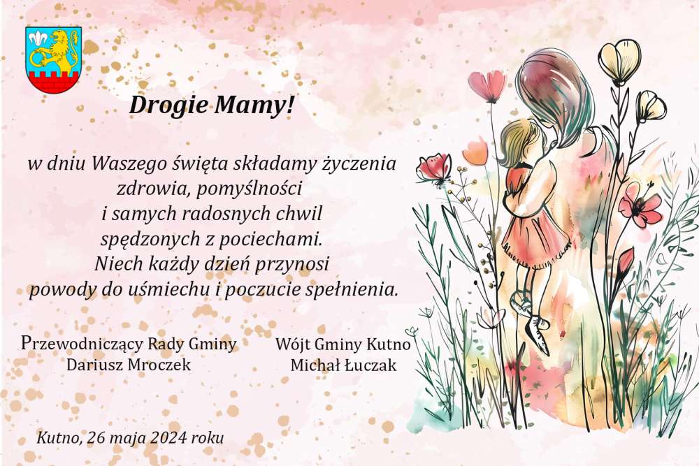 Z okazji Dnia Matki Wójt Gminy Kutno Michał Łuczak i Przewodniczący Rady Gminy Kutno Dariusz Mroczek składają wszystkim Mamom najserdeczniejsze życzenia.