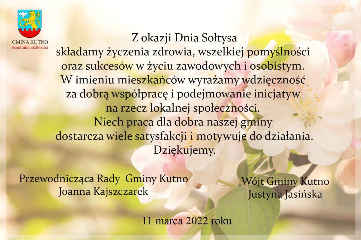 Z okazji Dnia Sołtysa Wójt Gminy Kutno Justyna Jasińska i Przewodnicząca Rady Gminy Kutno Joanna Kajszczarek składają życzenia i dziękują za pracę na rzecz mieszkańców naszej gminy