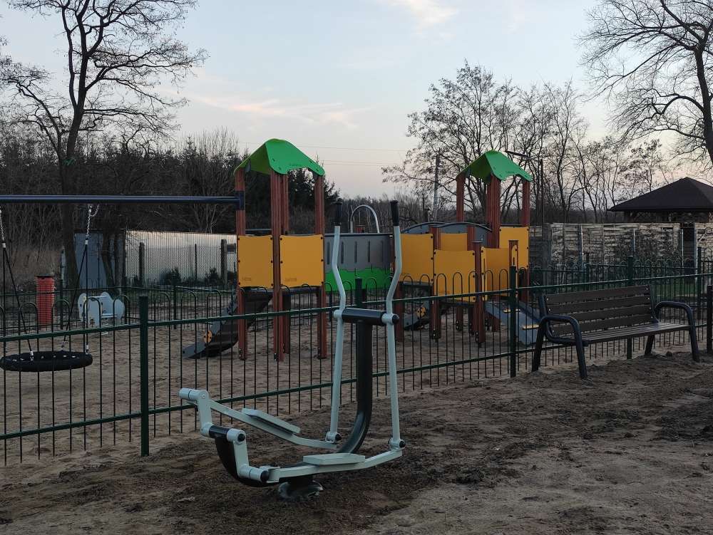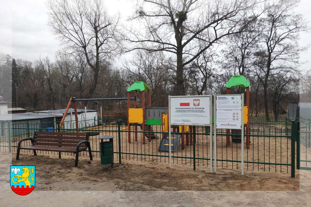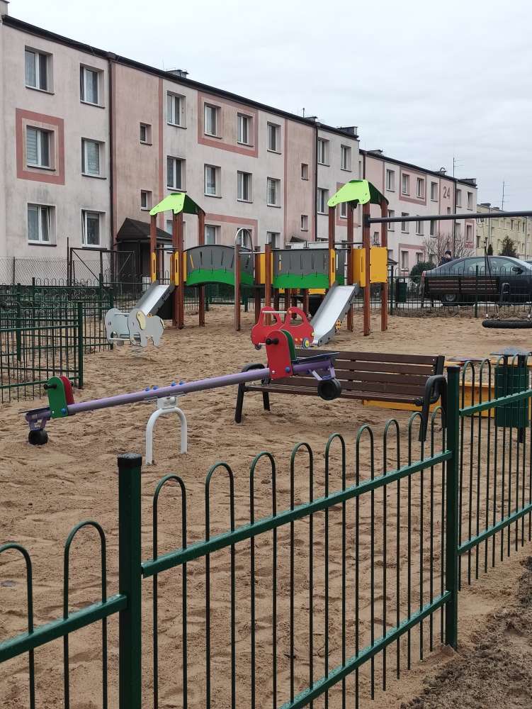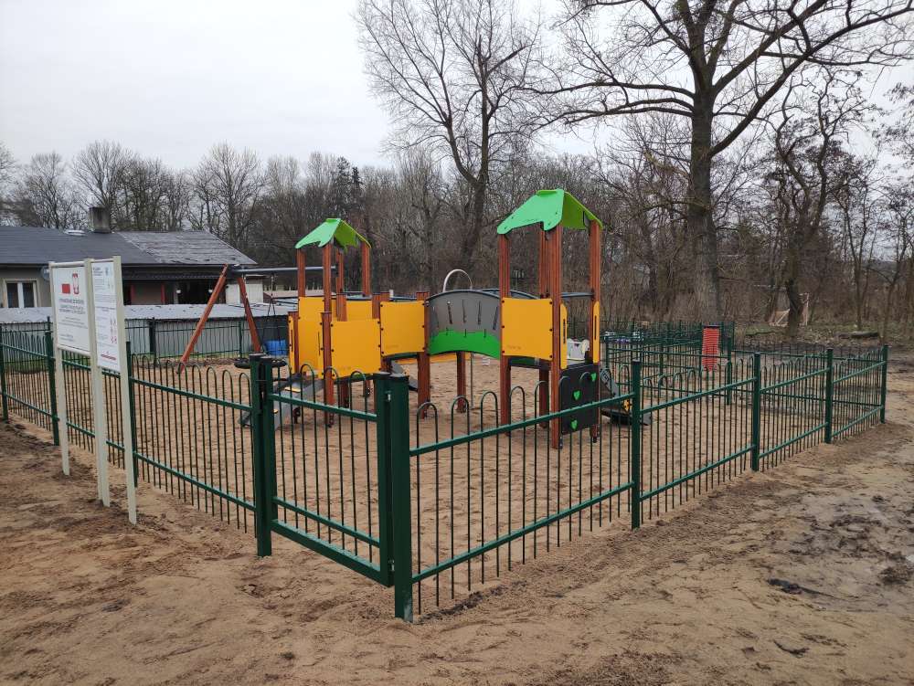 Plac zabaw został ogrodzony , dodatkowo zamontowano ławki i kosze na śmieci.