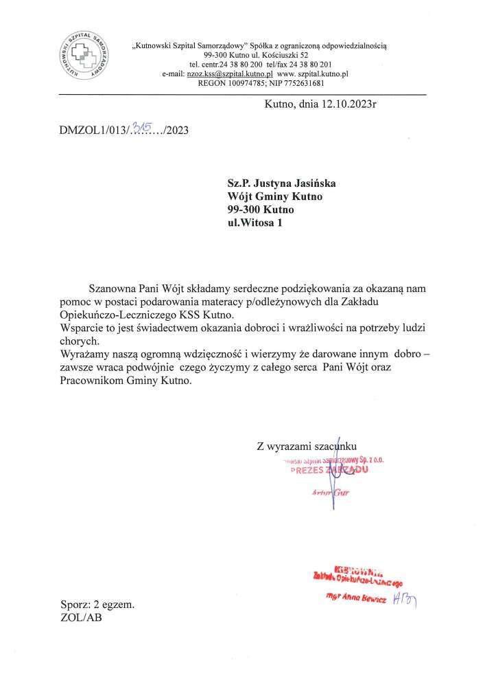 Z inicjatywy Wójt Gminy Kutno Justyny Jasińskiej udzielając wsparcia Kutnowskiemu Szpitalowi Samorządowemu Sp. z o.o. Gmina Kutno zakupiła dla Zakładu Opiekuńczo Leczniczego, będącego oddziałem Kutnowskiego Szpitala Samorządowego 5 sztuk materacy przeciwodleżynowych zmiennociśnieniowych Bio Flote 5000, które zostały przekazane na podstawie umowy w grudniu 2023 roku.