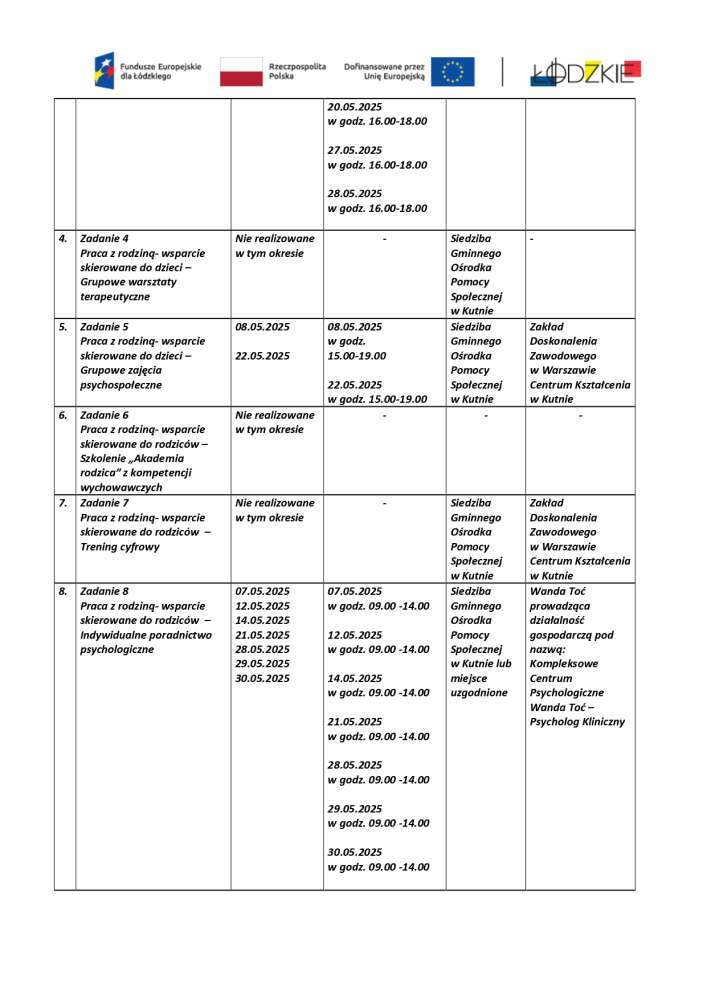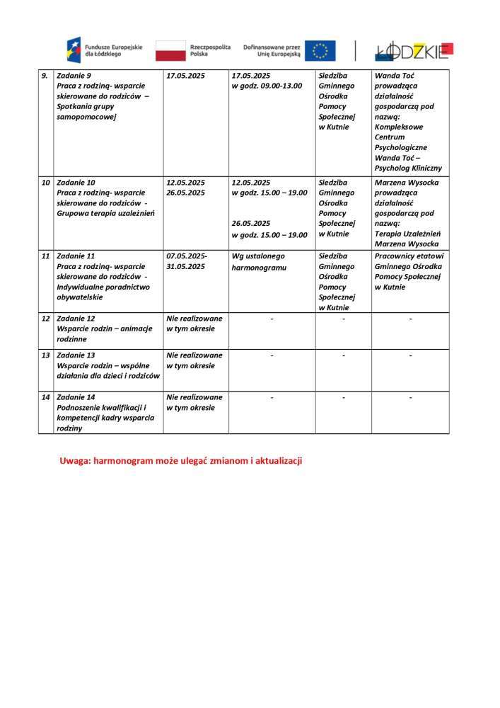 Harmonogram realizacji projektu „Wsparcie rodziny w Gminie Kutno”
