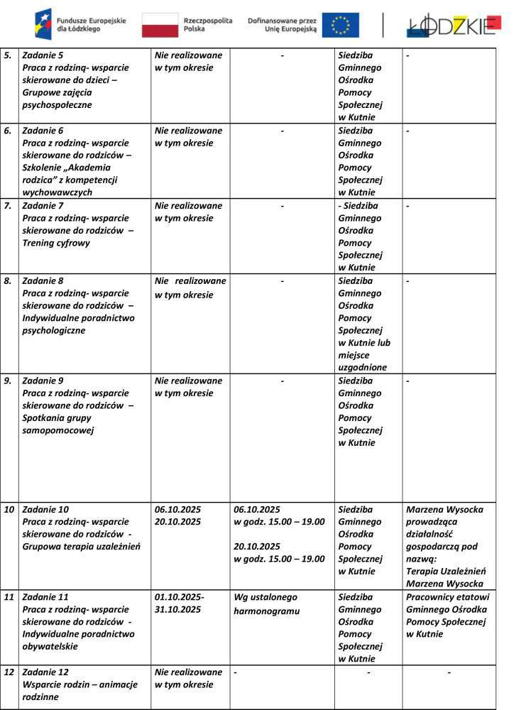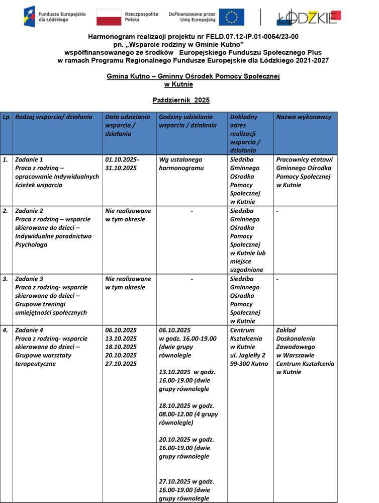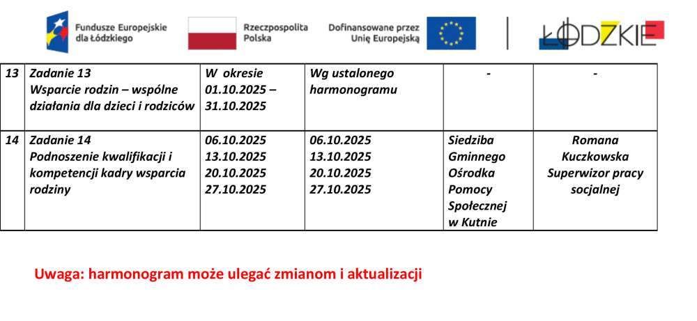 Poniżej publikujemy harmonogram realizacji projektu nr FELD.07.12-IP.01-0054/23-00 pn. „Wsparcie rodziny w Gminie Kutno"współfinansowanego ze środków Europejskiego Funduszu Społecznego Plus w ramach Programu Regionalnego Fundusze Europejskie dla Łódzkiego 2021-2027 realizowanego przez Gminny Ośrodek Pomocy Społecznej w Kutnie