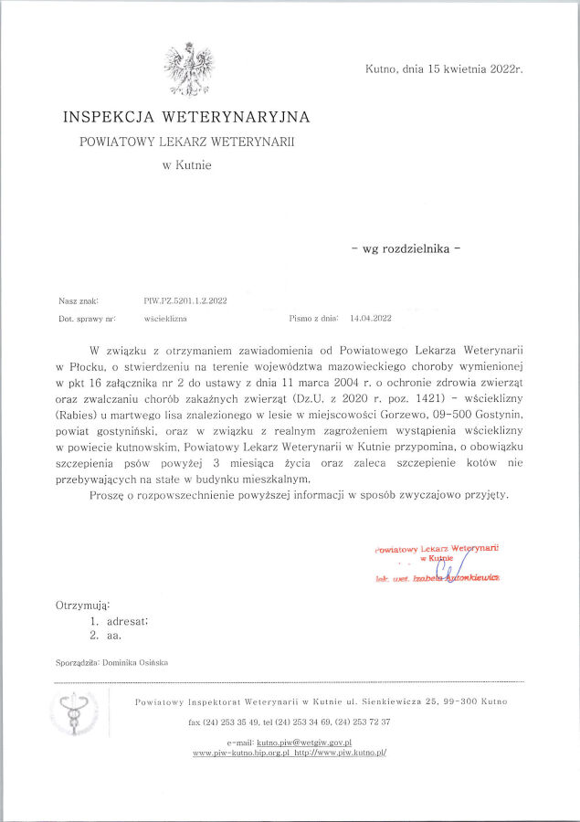 Poniżej informacja Powiatowego Lekarza Weterynarii dot. wścieklizny.