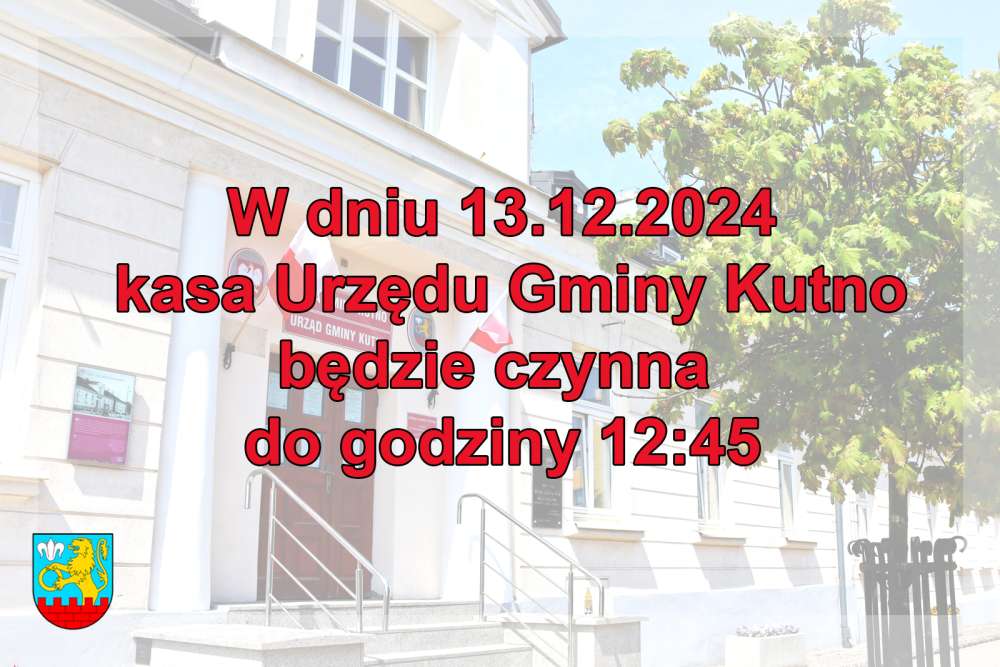 Informujemy, że w dniu 13.12.2024 roku (piątek) kasa Urzędu Gminy Kutno będzie otwarta do godziny 12:45. Za utrudnienia przepraszamy.
