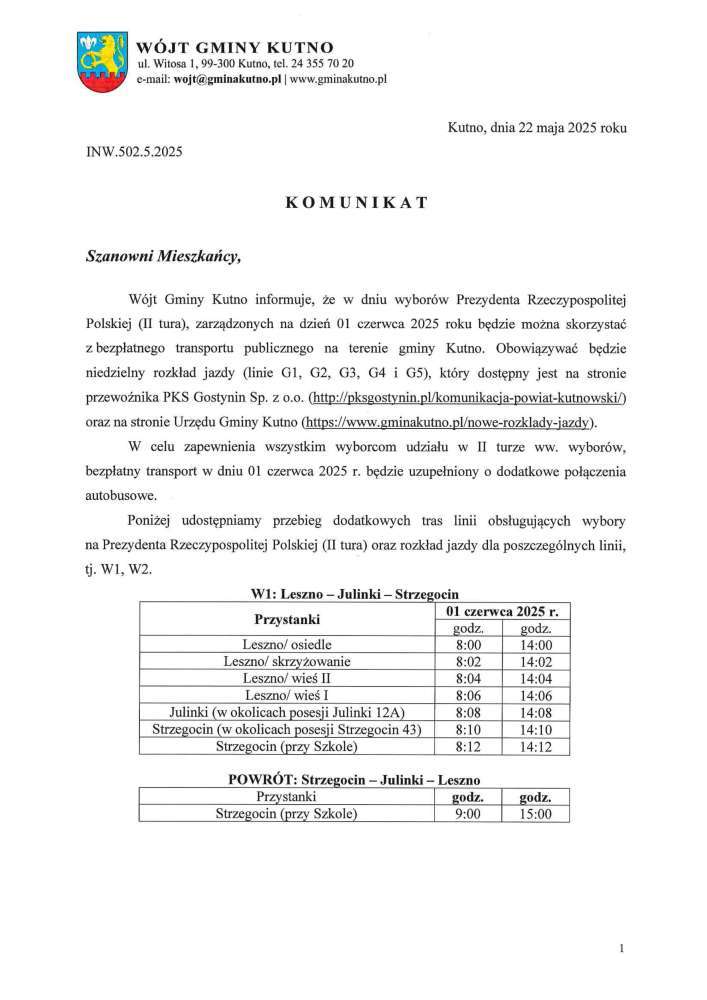 Poniżej informacja dotycząca bezpłatnego transportu do lokalu wyborczego.