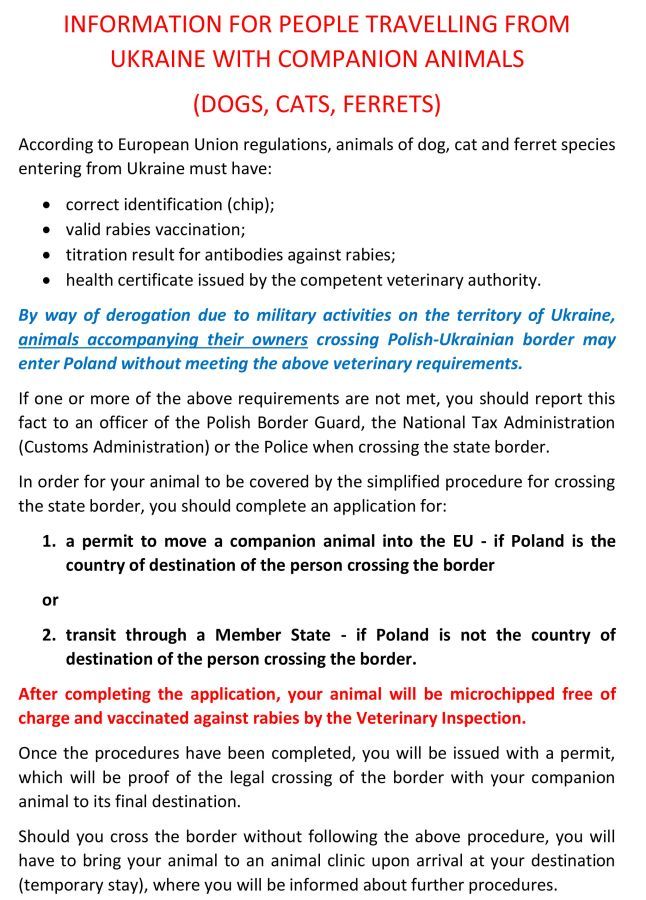 Informujemy, że zgodnie z decyzją kierownictwa Głównego Inspektoratu Weterynarii, w porozumieniu z kierownictwem Ministerstwa Rolnictwa i Rozwoju Wsi oraz z Krajową Administracja Skarbową, zmienione zostały procedury dotyczące wjazdu podróżnych z terenu Ukrainy ze zwierzętami towarzyszącymi przemieszczanymi w celach niehandlowych.