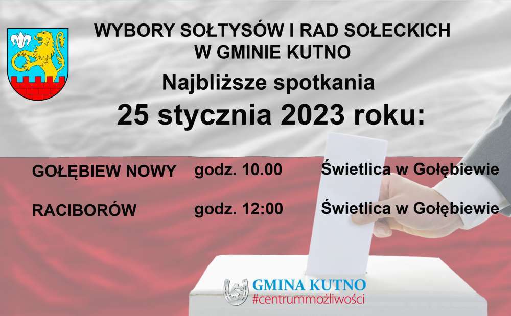 Trwają spotkania sołeckie, na których wybrani są Sołtysi i Rady sołeckie poszczególnych miejscowości w gminie Kutno. Kolejne odbędą się już 23 stycznia 2023 dla mieszkańców Grabkowa, Piwek, Bożej Woli i Leszczynka oraz 25 stycznia 2023 dla mieszkańców Gołębiewa Nowego i Raciborowa. Natomiast 24 stycznia ponownie odbędą się spotkania dla mieszkańców Gnojna i Marianek.