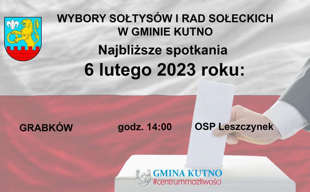 Trwają spotkania sołeckie, na których wybierani są Sołtysi i Rady sołeckie poszczególnych miejscowości w gminie Kutno. Kolejne odbędą się już 6 lutego 2023 dla mieszkańców Grabkowa, 7 lutego 2023 dla mieszkańców Nowej Wsi i Nagodowa oraz 8 lutego Krzesina, Podczach i Wroczyn. Dokładne godziny i miejsca spotkań znajdziecie Państwo na poniższych grafikach.