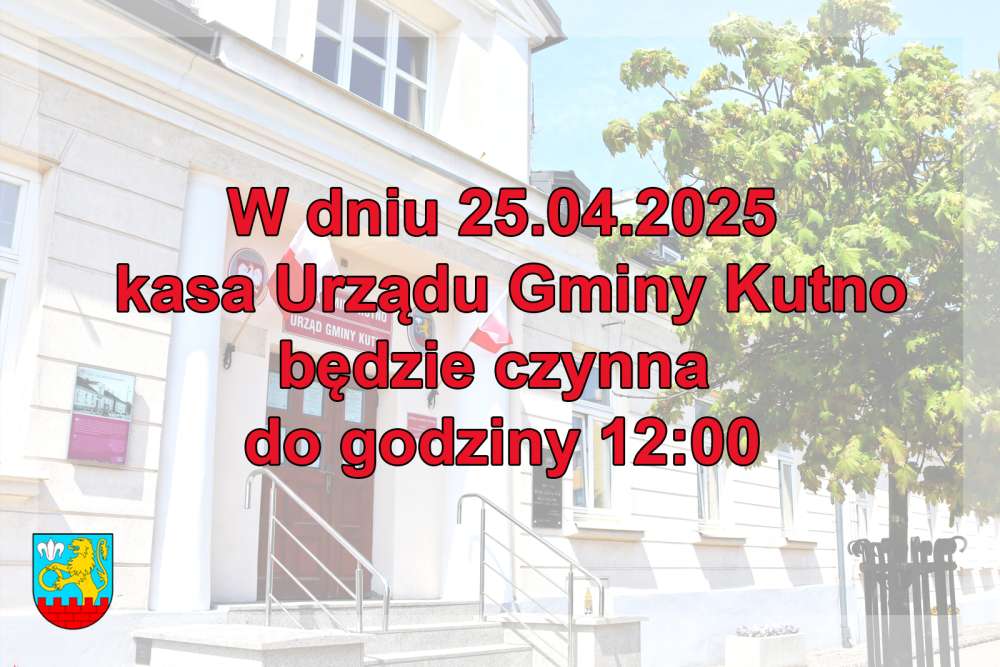 Informujemy, że w dniu 25.04.2025 roku (piątek) kasa urzędu będzie otwarta do godziny 12:00.