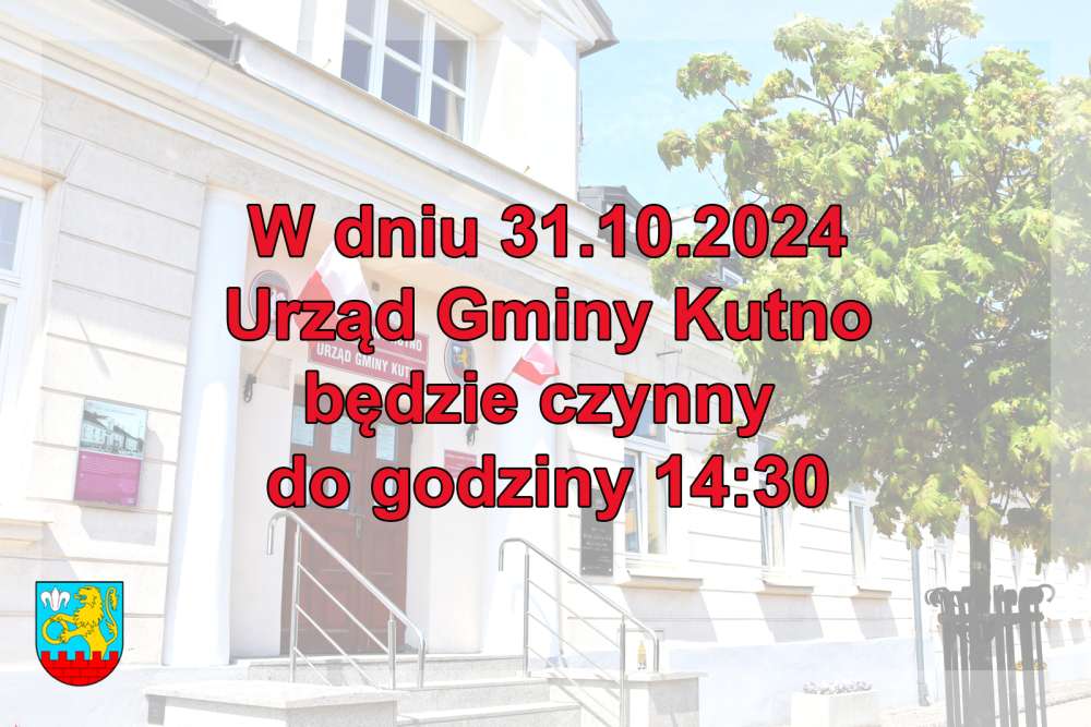 Informujemy, że w dniu 31.10.2024 roku (czwartek) Urząd Gminy Kutno, Gminny Ośrodek Pomocy Społecznej i Centrum Usług Wspólnych będą czynne w godzinach 7:30 -14:30. Kasa urzędu będzie otwarta do godziny 13:30.