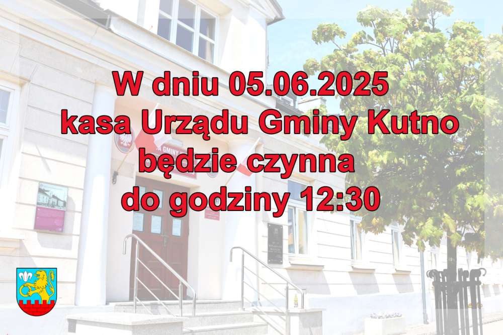 Informujemy, że w dniu 05.06.2025 roku (czwartek) kasa urzędu będzie otwarta do godziny 12:30. Za utrudnienia przepraszamy.