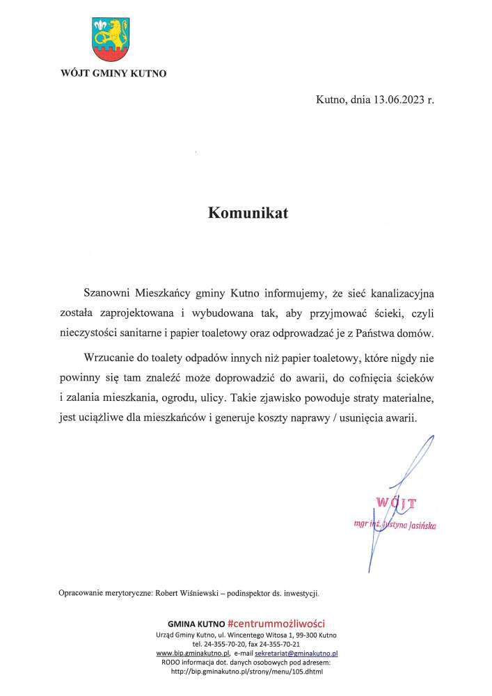 Poniżej treść komunikatu Wójt Gminy Kutno Justyny Jasińskiej dot. niewrzucania odpadów do kanalizacji.