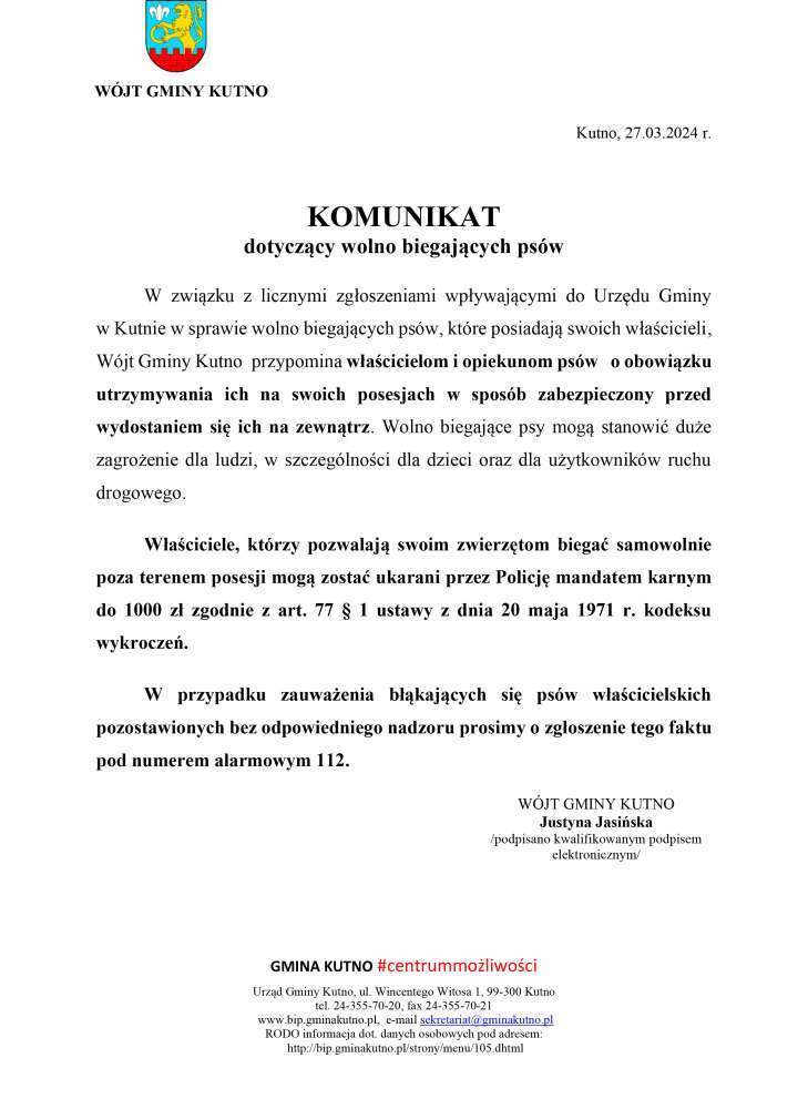 Poniżej treść komunikatu Wójt Gminy Kutno Justyny Jasińskiej dotyczącego wolno biegających psów.