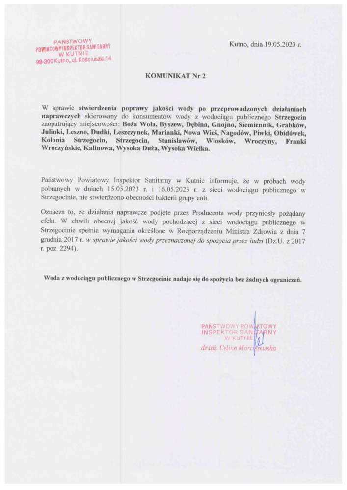 Poniżej treść komunikatu Państwowego Powiatowego Inspektora Sanitarnego w Kutnie w sprawie jakości wody z wodociągu publicznego w Strzegocinie zaopatrujący miejscowości: Boża Wola, Byszew, Dębina, Gnojno, Siemiennik, Grabków, Julinki, Leszno, Dudki, Leszczynek, Marianki, Nowa Wieś, Nagodów, Piwki, Obidówek, Kolonia Strzegocin, Strzegocin, Stanisławów, Włosków, Wroczyny, Franki Wroczyńskie, Kalinowa, Wysoka Duża, Wysoka Wielka.