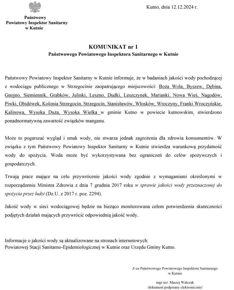 Poniżej treść komunikatu Państwowego Powiatowego Inspektora Sanitarnego w Kutnie dot. badania wody.