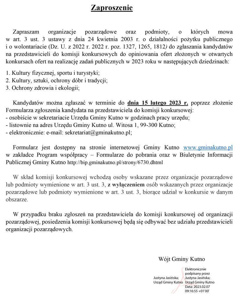 Wójt Gminy Kutno Justyna Jasińska zaprasza przedstawicieli do komisji konkursowej oceniającej oferty złożone w otwartych konkursach na realizację zadań publicznych.