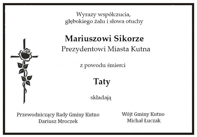 Kondolencje dla  Pana Mariusza Sikory od od Wójta Gminy Kutno Michała Łuczaka i Przewodniczącego Rady Gminy Kutno Dariusza Mroczka