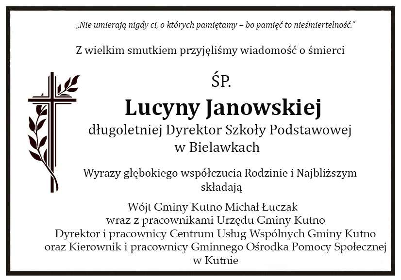 Kondolencje dla najbliższych śp. Lucyny Janowskiej od Wójta Gminy Michała Łuczaka, Centrum Usług Wspólnych Gminy Kutno oraz Gminnego Ośrodka Pomocy Społecznej w Kutnie.