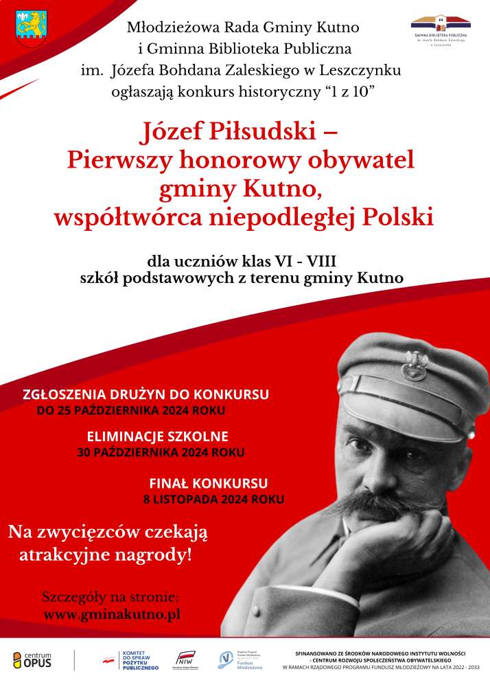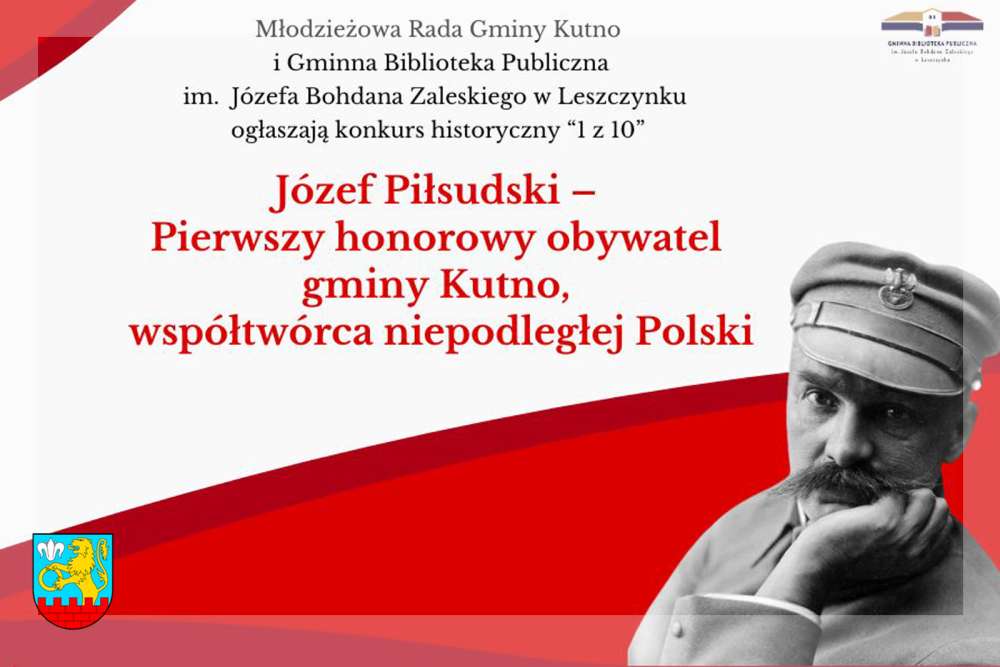 Młodzieżowa Rada Gminy Kutno oraz Gminna Biblioteka Publiczna im. J.B. Zaleskiego w Leszczynku zapraszają uczniów klas VI-VIII szkół podstawowych z terenu gminy Kutno do udziału w konkursie historycznym „1 z 10". Tematem przewodnim jest postać Józefa Piłsudskiego, który nie tylko odegrał kluczową rolę w odzyskaniu przez Polskę niepodległości, ale również został pierwszym honorowym obywatelem gminy Kutno.