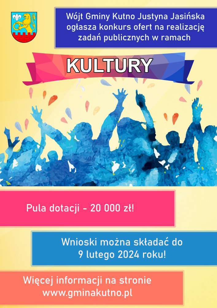 Wójt Gminy Kutno Justyna Jasińska zaprasza do składania ofert na realizację zadań publicznych z obszaru kultury. W zakresie kultury, sztuki, ochrony dóbr kultury i tradycji można realizować jedno z poniższych działań: