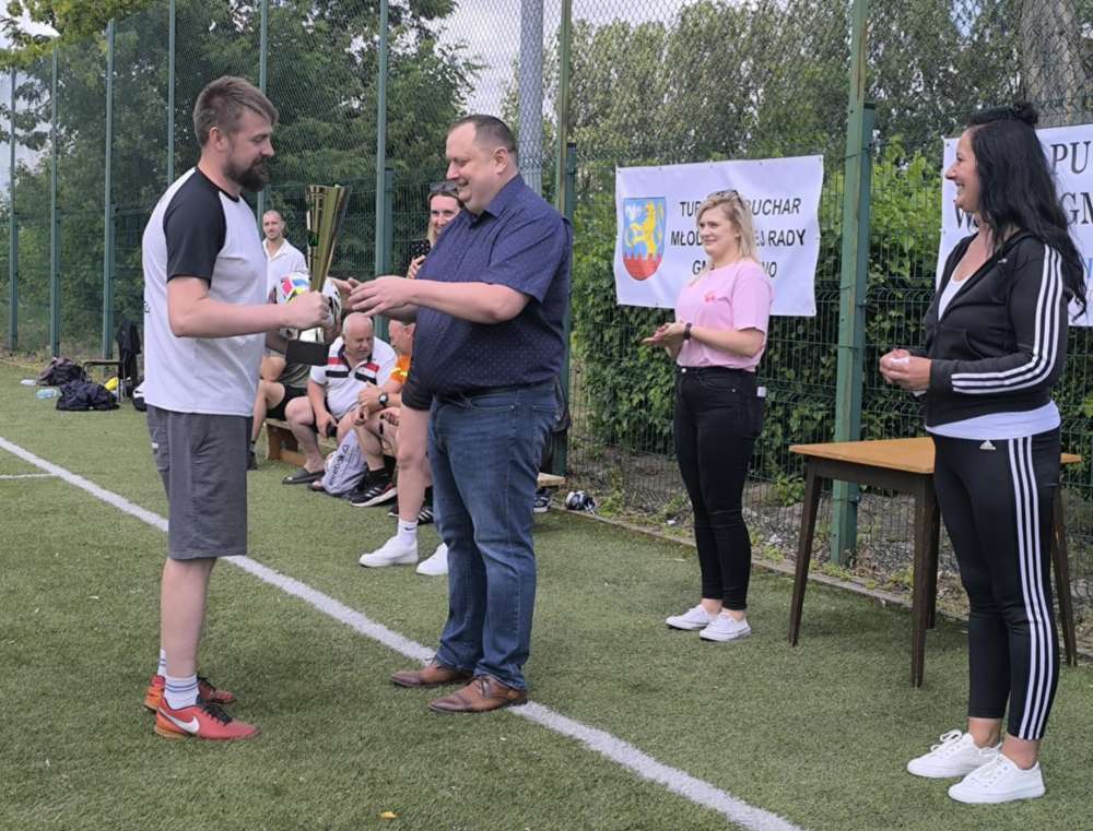 Młodzi piłkarze odebrali nagrody i puchary od wiceprzewodniczącego młodzieżowej Rady Gminy Kutno Szymona Podlasina.