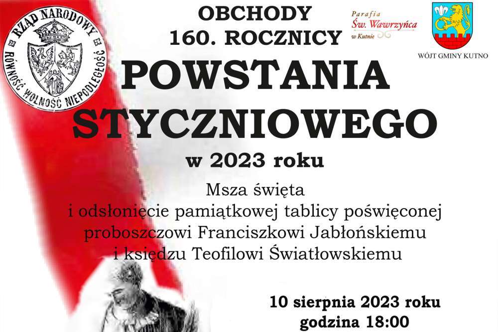 Już dzisiaj w kościele pw. św. Wawrzyńca w Kutnie odbędzie się msza święta celebrowana przez Biskupa Łowickiego Andrzeja Franciszka Dziubę i odsłonięcie pamiątkowej tablicy. Po mszy zapraszamy na koncert w wykonaniu Anny Jeremus - Lewandowskiej. Wydarzenie jest organizowane w ramach Gminnych obchodów 160. rocznicy Powstania Styczniowego.