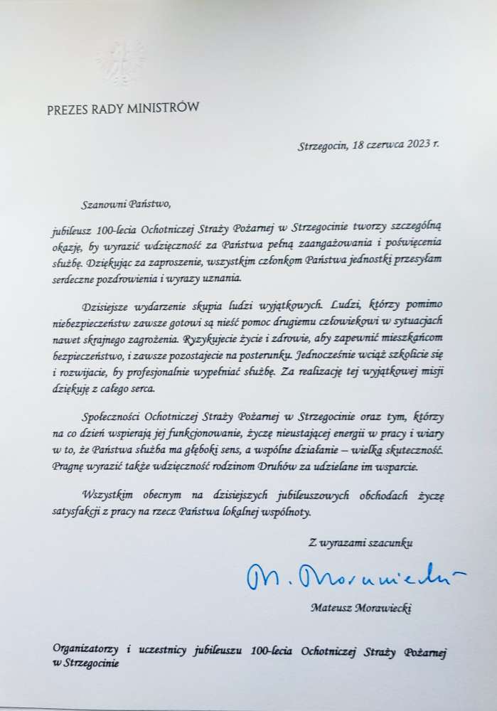 Na ręce Prezesa Mirosława Karczewskiego został złożony list gratulacyjny od Prezesa Rady Ministrów Mateusza Morawieckiego, który został odczytany przez Wójta Gminy Kutno Justynę Jasińską oraz okoliczne grawertony od zaproszonych gości.