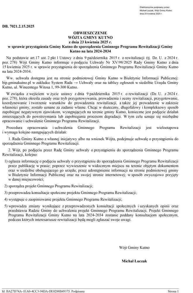 Poniżej treść  OBWIESZCZENIA WÓJTA GMINY KUTNO z dnia 23 kwietnia 2025 r. w sprawie przystąpienia Gminy Kutno do sporządzenia Gminnego Programu Rewitalizacji Gminy Kutno na lata 2024-2034