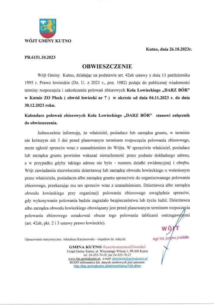 Poniżej treść obwieszczenia Wójt Gminy Kutno dotyczącego terminów rozpoczęcia i zakończenia i miejsc polowań Koła Łowieckiego Darz Bór