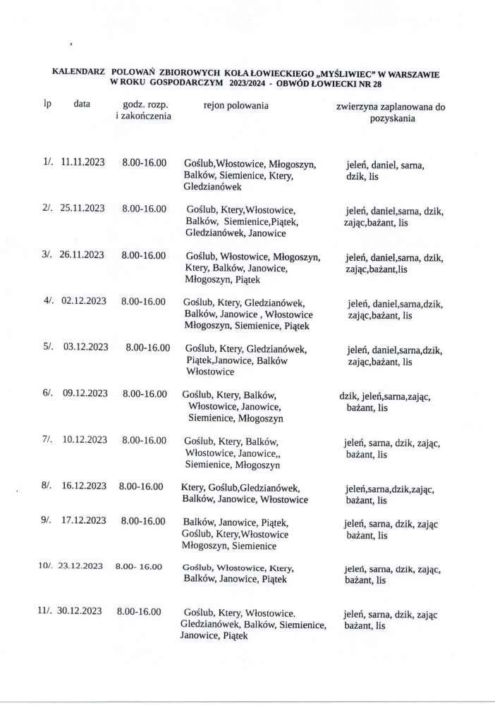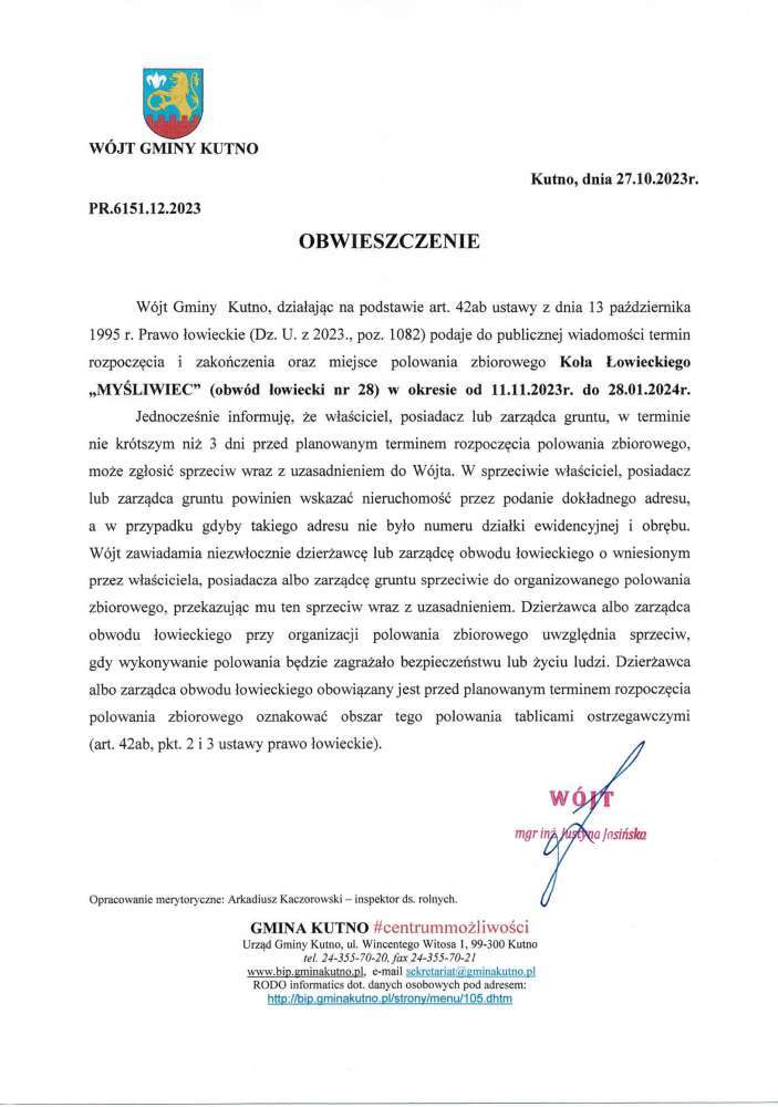 Poniżej treść obwieszczenia Wójt Gminy Kutno dotyczącego terminów rozpoczęcia i zakończenia i miejsc polowań Koła Łowieckiego Myśliwiec