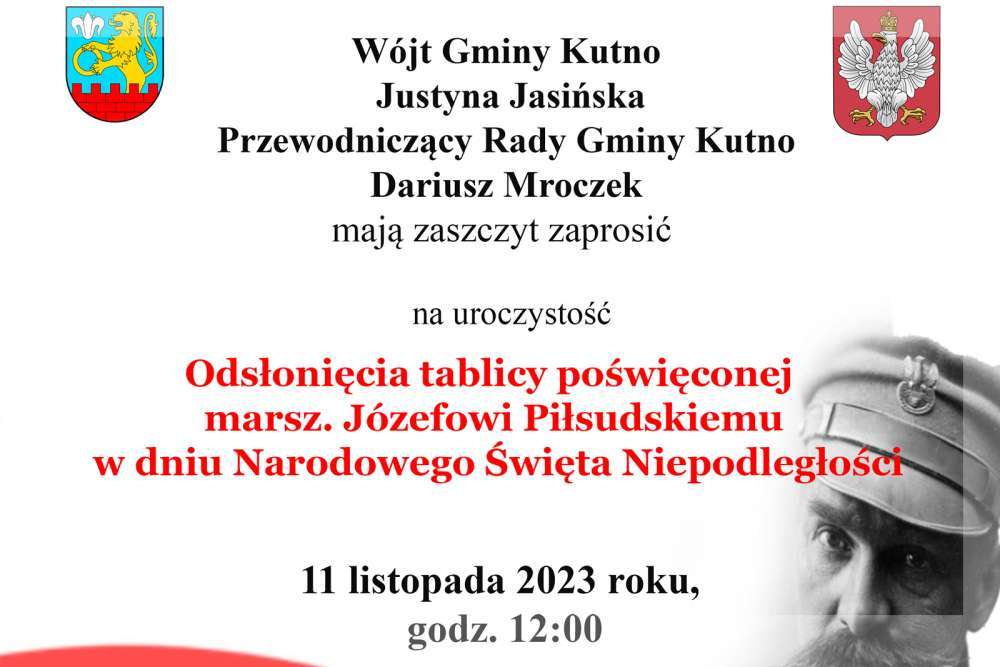 Wójt Gminy Kutno Justyna Jasińska i Przewodniczący Rady Gminy Kutno Dariusz Mroczek zapraszają na uroczystość odsłonięcia tablicy poświęconej marsz. Józefowi Piłsudskiemu, która odbędzie się w dniu 11 listopada 2023 roku o godzinie 12:00.
