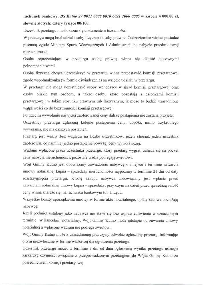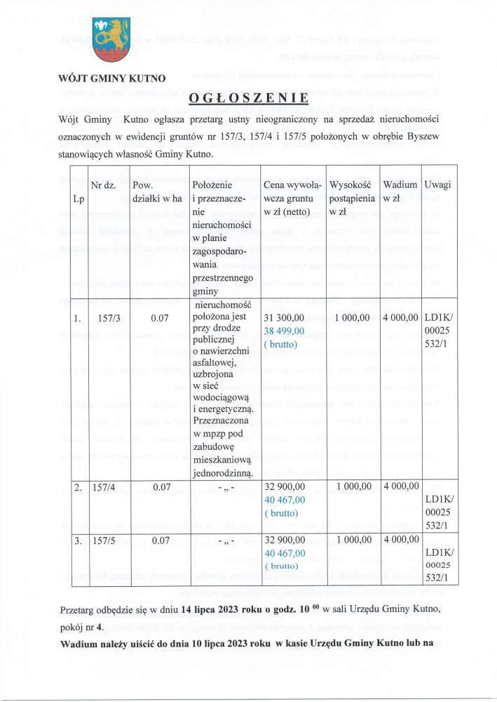 Wójt Gminy Kutno Justyna Jasińska ogłasza przetarg ustny nieograniczony na sprzedaż nieruchomości w Byszewie. Poniżej treść ogłoszenia.