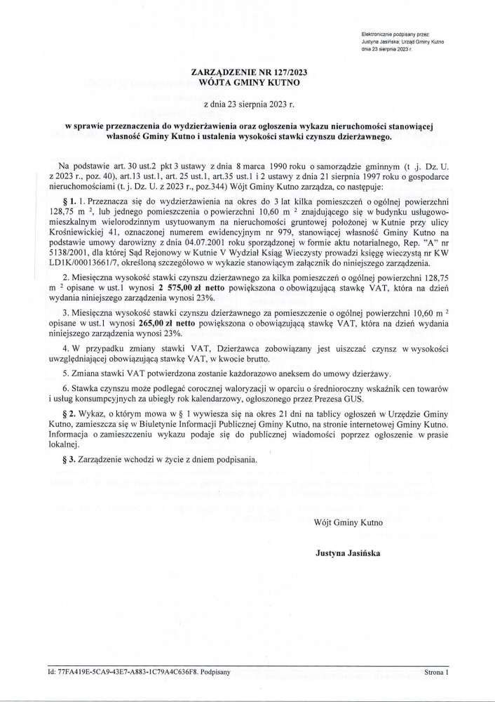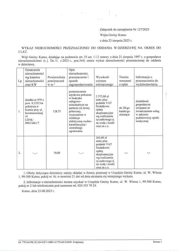 Zarządzenie w sprawie przeznaczenia do wydzierżawienie oraz ogłoszenie wykazu nieruchomości stanowiącej własność Gminy Kutno i ustalenia wysokości stawki czynszu dzierżawnego