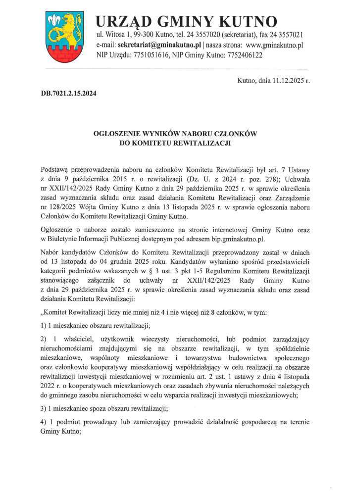 Poniżej treść ogłoszenia wójta gminy Kutno o wynikach  naboru Członków do Komitetu Rewitalizacji.