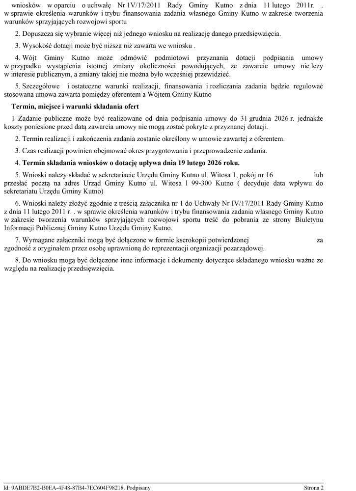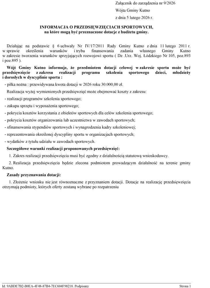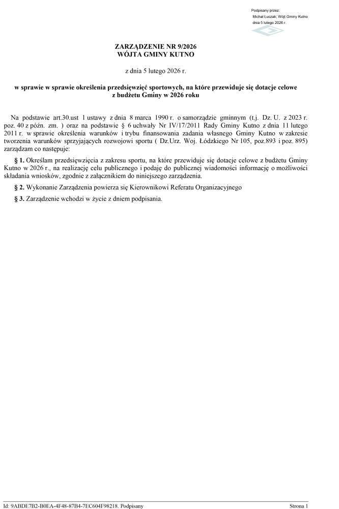 Poniżej treść zarządzenia Nr 9/2026 Wójta Gminy Kutno z dnia 05 lutego 2026 roku w sprawie określenia przedsięwzięć sportowych, na które przewiduje się dotacje celowe z budżetu Gminy w 2026 roku.
