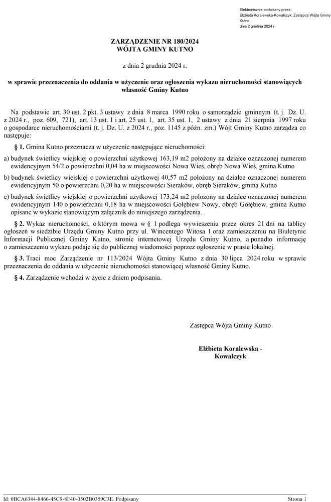 Poniżej treść zarządzenia wójta w sprawie przeznaczenia do oddania w użyczenie oraz ogłoszenia wykazu nieruchomości stanowiących własność Gminy Kutno.