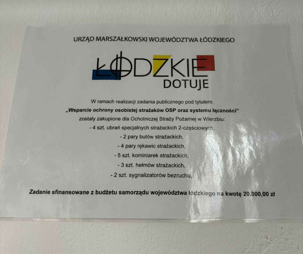 Ochotnicza Straż Pożarna w Wierzbiu otrzymała dofinansowanie od Zarządu Województwa Łódzkiego w ramach otwartego konkurs ofert na realizację zadania publicznego z zakresu bezpieczeństwa publicznego pn. „Wsparcie ochrony osobistej strażaków OSP oraz system łączności".