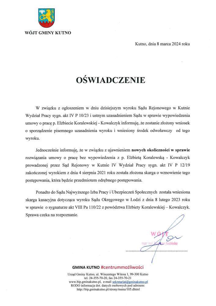 Poniżej treść oświadczenia Wójt Gminy Kutno Justyny Jasińskiej z dnia 08.03.2024