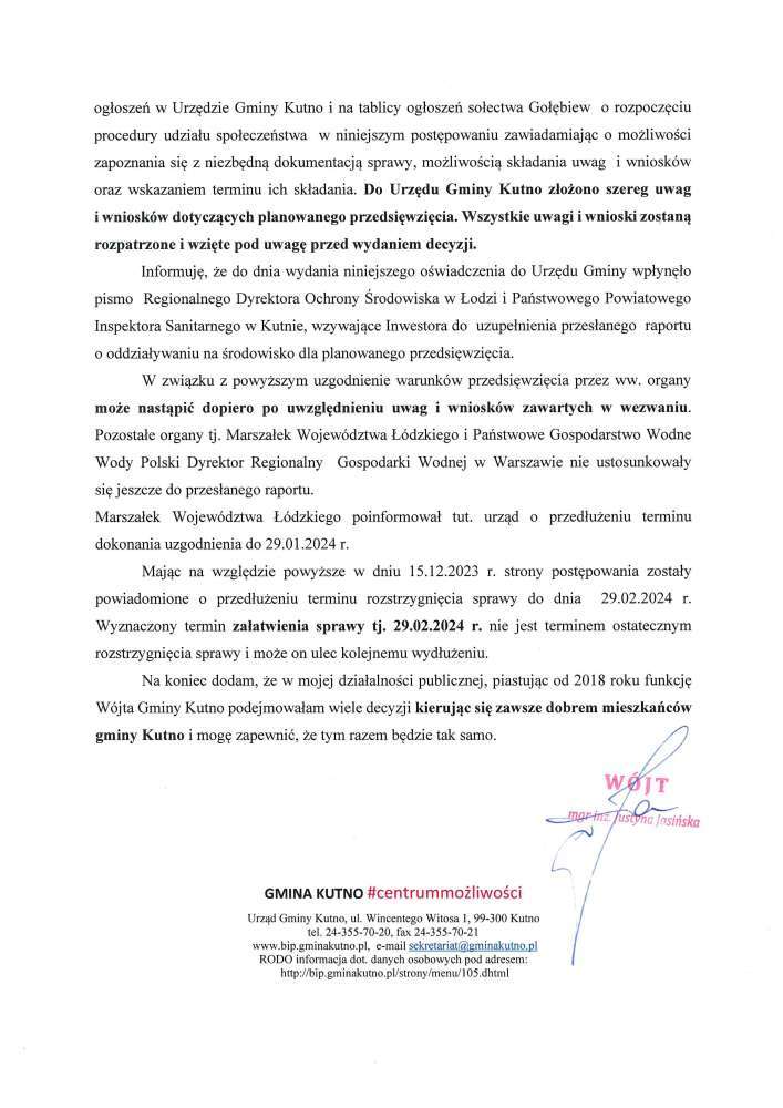 Poniżej treść oświadczenia Wójt Gminy Kutno Justyny Jasińskiej dotyczącego wydania decyzji o środowiskowych uwarunkowaniach dla przedsięwzięcia polegającego n rozbudowie istniejącego Zakładu Gospodarowania Odpadami "Eko Alf"w Gołebiewie Nowym.