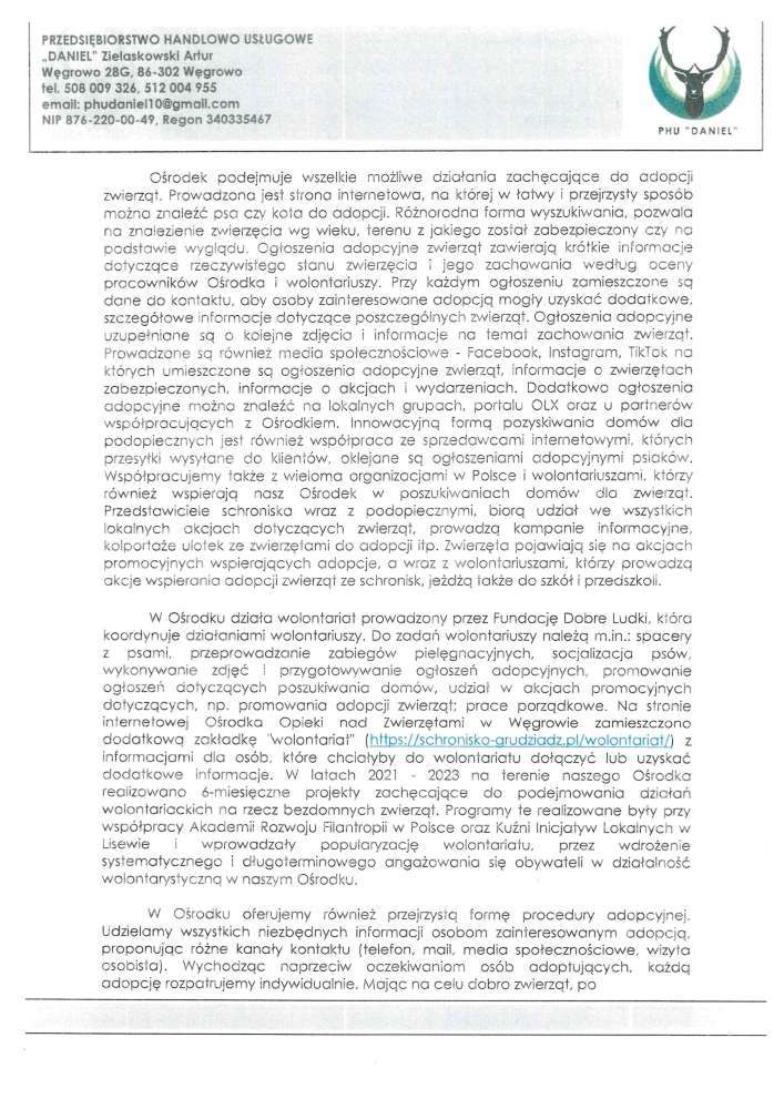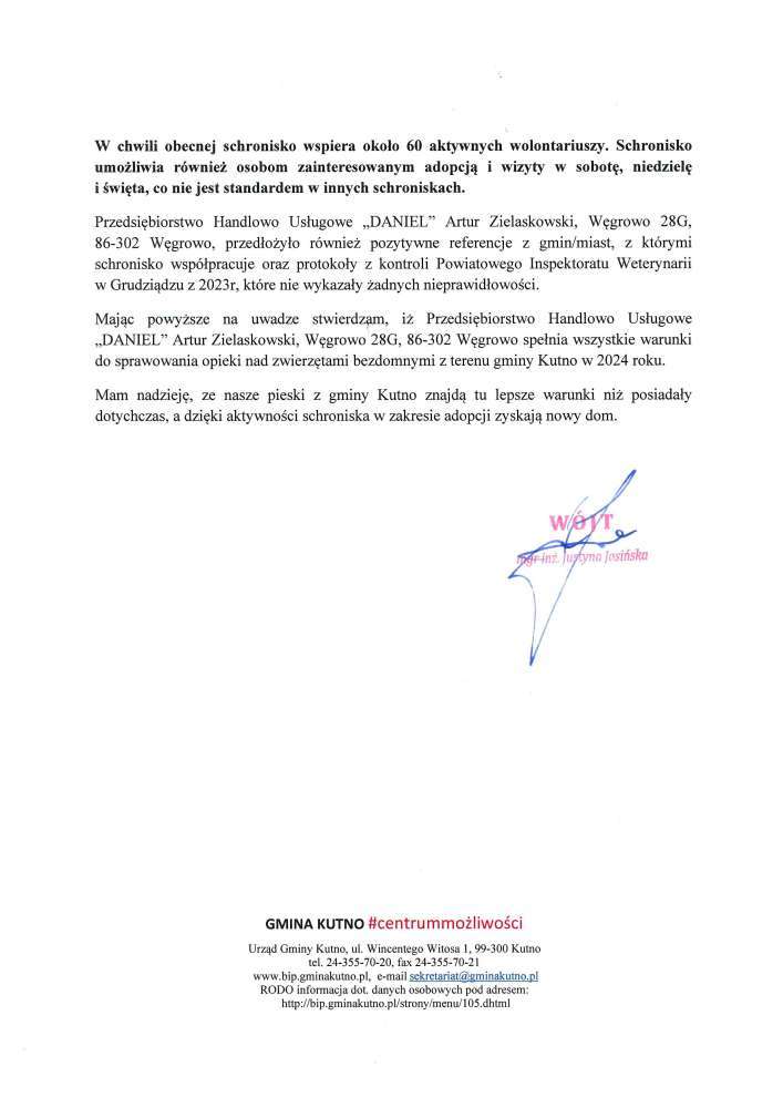 Gmina Kutno informuje, że w dniu 28.12.2023 roku została podpisana umowa na wykonanie usługi polegającej na "Wyłapywaniu bezdomnych zwierząt z terenu gminy Kutno oraz zapewnienie im opieki w schronisku dla bezdomnych zwierząt w 2024 roku" z Przedsiębiorstwem Handlowo Usługowym "DANIEL" Artur Zielaskowski, Węgrowo 28 G, 86-302 Węgrowo.