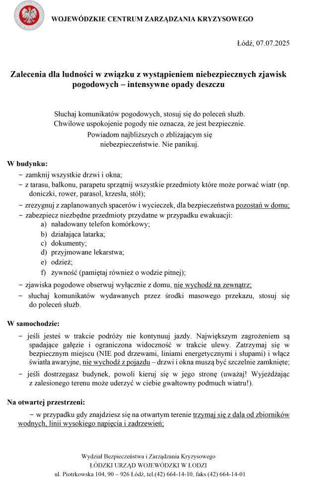 Poniżej zalecenia Wojewódzkiego Centrum Zarządzania Kryzysowego w przypadku wystąpienia niebezpiecznych zjawisk pogodowych oraz zalecenia dla ludności w związku z wystąpieniem niebezpiecznych zjawisk pogodowych.