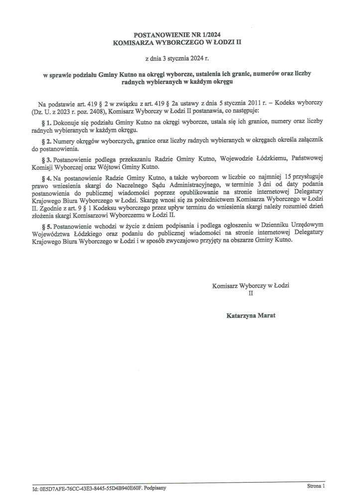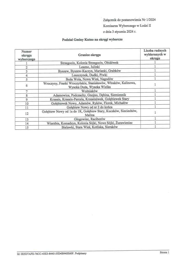 Poniżej treść postanowienia Komisarza Wyborczego w Łodzi w sprawie podziału Gminy Kutno na okręgi wyborcze, ustalenia ich granic, numerów oraz liczb radnych wybieranych w każdym okręgu.