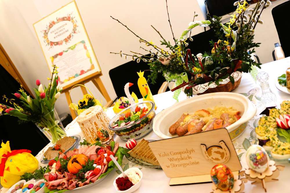Na stole Koła Gospodyń Wiejskich w Strzegocinie znaleźć mogliśmy koszyk wielkanocny z chlebem, jajkiem, solą, wędliną, chrzanem, bukszpanem, barankiem wielkanocnym i babką wielkanocną. Ponadto przygotowano sałatkę warstwową, jajka faszerowane, pasztet, babkę gotowaną, babkę wielkanocną, bukiet wędlin, białą kiełbaskę pieczoną z cebulką i jabłkiem, ćwikłę i sos chrzanowy, schab w galarecie oraz jajka święcone.